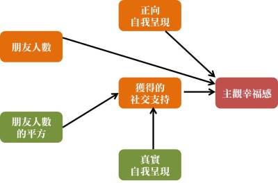 首先我們看到朋友人數和主觀幸福感有直接的正相關,但朋友人數的平方則和主觀幸福感有一個間接的關係,這個結果暗示了其實只有朋友人數在一個中間值的時候,才會感受到有較高程度的社交支持。另外我們也可以看到在臉書上自我呈現的方式也會影響主觀的幸福感,正向自我呈現的人基本上本來就很high了,所以直接匯有較高的幸福感;但真實自我呈現的人,必須要在獲得社交支持的情況下才會有較高的幸福感。雖然結果看起來蠻合情合理的,但大家要記得這是一個相關性的研究,其實不太能夠真的確認哪個是原因,哪個是結果。以可能是因為幸福感高,所以才做正向自我呈現、才會交比較多的朋友。