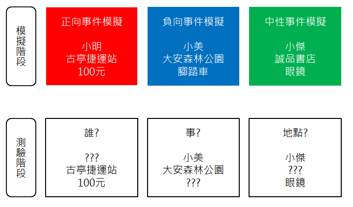 在哈佛大學的Szpunar教授等人針對這個議題做了一個研究,在他們的研究中,他們先蒐集與這個實驗參與者有關的110則生活事件,從中去挑選對於這些人較相關的人、事、地點,針對每一個人他們會產生一個不同的刺激材料清單。接著他們讓實驗參與者到實驗室進行事件模擬的階段,在這個階段他們會被告知要運用畫面中出現的人名、地點和事情來想像一個未來會發生的正向、負向或是中性的事件(見下圖)。所以當他們看到下圖中紅色的畫面時,他們必須要想像一個正向事件是包含小明、古亭捷運站和100元的,一個可能的故事就是小明在古亭捷運站協助老奶奶搭捷運,老奶奶因為感謝他的善心給了他100元。在模擬的階段他們總共要模擬90的事件(每種情緒各30個)。在所有事件都模擬完後的10分鐘以及一天後,他們需要進行測驗階段,在測驗階段他們會被告知跟這些事件有關的兩個元素,然後他們要提取那個在模擬時也包含的第三個元素,同樣以正向事件模擬為例,實驗參與者會看到「古亭捷運站」及「100元」,然後畫面上會提醒他們要回想這個事件的人物是誰?