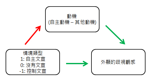 第一個實驗的結果顯示,讀完自主文宣後確實會降低歧視的觀感,但閱讀控制文宣那組歧視的觀感比起沒有看文宣的那組還要來的高,顯示並非勸導不要有歧視的觀感就會降低人們歧視的觀感,用了錯誤的方法反而會有不好的效果。他們另外做了一個有點取巧(因為一般而言不會把控制情境當作路徑分析的一個因子)的路徑分析(透過這個分析,可以推測不同因子之間的關係,例如A是否直接影響B還是要透過C才會對B造成影響),從下圖中可以看到情境對於歧視觀感的影響會受到動機的調節,但他們之前存在一個複雜的關係。圖中的紅色線條表示兩個因子之間有正相關(其中一個數值越大另一個的數值也越大,但並不表示兩者之間有因果關係),綠色線條則表示兩個因子之間有負相關(其中一個數值越大另一個的數值反而越小,同樣的並不表示兩者間有因果關係)。
