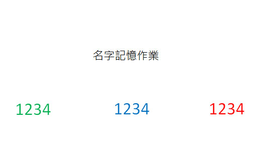針對名字記憶作業,他們要判斷現在畫面上的名字和四個之前的是否相同 (也就是先前介紹過的n-back作業);針對綠色的數字,他們要判斷數字的最後兩位數是否為11的倍數;針對藍色的數字,他們要判斷數字的最後兩位數是否為20的倍數;針對紅色的數字,他們要判斷數字的最後兩位數是否為25的倍數。在數字作業的部分,實驗參與者並不會一直看到數字,而是需要按特定的顏色鍵,該顏色的數字才會出現兩秒;此外,數字遞增的速度是不同的,所以其實是一個非常困難的作業。因為實驗參與者並非時時看到所有的數字,所以實驗者容忍正負一的答案,也就是說若綠色數字雖然要針對最後兩位數是否為11的倍數做判斷,但只要在最後兩位數為10、11、12時按鍵判斷,都算是答對的。