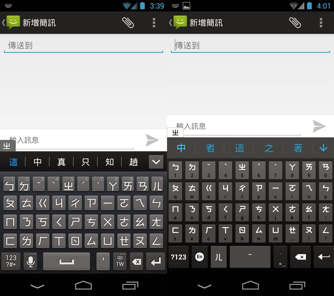 當時搜尋了一下,選擇了IQQI快注音,可能是先入為主的觀念,總覺得三星輸入法比較好用,介面也長得比較好看。這幾天Google推出了自己的注音輸入法,讓人忍不住想要嘗鮮一下。下圖左邊是三星輸入法的介面、右邊是Google注音的介面