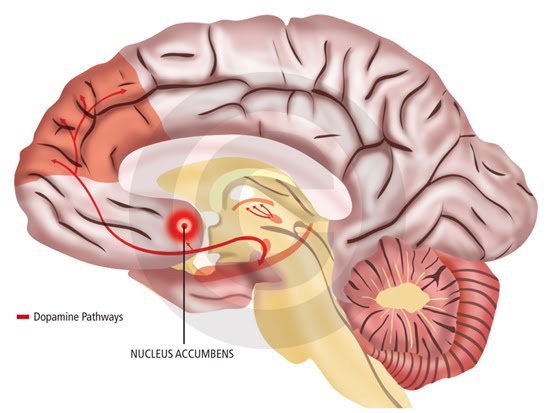 結果顯示,對於食物的敏感程度、以及腦中Nucleus Accumbens這個區域(如下圖紅色圓圈標示的區域)在進行go/no-go作業時看到食物圖片的活化程度,都能夠預測實驗參與者對於食物的渴望程度。Nuclues Accumbens這個區域和獎賞的處理有關係,也是多巴胺系統中一個重要的腦部結構。