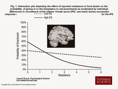 除了Nucleus Accumbens的涉入之外,Inferior Frontal Gyrus (IFG)的活動程度也和對食物的衝動有關係,不過IFG和抑制食物的衝動有關係。若這個腦區在看到食物圖片的no-go作業下,有越高的活化程度,顯示實驗參與者越能夠壓抑對食物的慾望,也就越不會有想要吃東西的衝動。下圖顯示了IFG活化程度高的個體,面對食物的壓抑指數和他們的實際行為有負相關,也就是說越能壓抑的人,越不會有吃東西的衝動。
