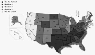 下圖是研究團隊根據九個指標 (四個與懲罰強度有關係、兩個與開放程度有關係、兩個與宗教信仰有關係、外國移民的人口),所做出的緊繃程度評分,顏色越深的就是越緊繃的州。從圖中可以發現,美國南部的州是最緊繃的,而西岸以及東北角則是比較放鬆的州。這樣的結果,基本上和過去類似的研究結果相近。比較有趣的是,緊繃程度也和該州共和黨的政黨支持度有關係,越緊繃的州越傾向支持共和黨。雖然如此,作者認為這樣的政黨支持意象,並不能全然和緊繃劃上等號,僅能說兩者可能是相輔相成的。