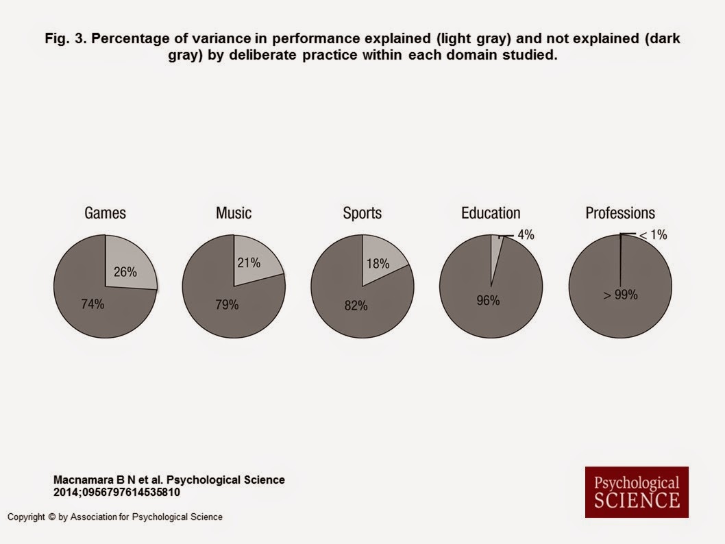 有研究團隊回顧了過去一些針對練習與表現做探討的研究,根據領域去做分類,以及考量他們用什麼方式去計算練習時間、表現好壞。值得注意的是,這類研究通常是針對專業人士,例如專業音樂家、職業運動員等所做的研究。