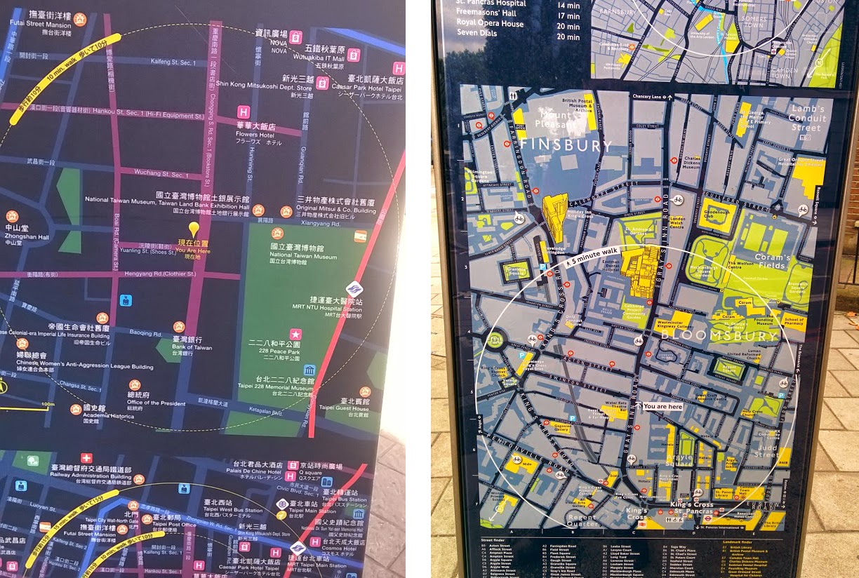- 倫敦的版本有箭頭,告訴你這張地圖的前方是哪裡;但在台北市的版本,則沒有清楚的標示。此外地圖擺放的位置也有很大的差異,倫敦的地圖看過去完全不用做心象的旋轉,眼睛看過去的前方就是地圖的上方(也就是箭頭所標示的方式);但筆者所拍攝這張台北市版的地圖,則還需要旋轉90度,前方才是地圖上方所標示的位置。