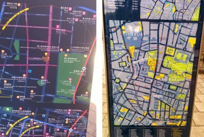 除了地鐵圖之外,其實平面地圖的設計也是值得大家思考的。台北市在今年推出了類似下面的地圖 (左邊),很顯然是參考了倫敦的做法 (右邊)