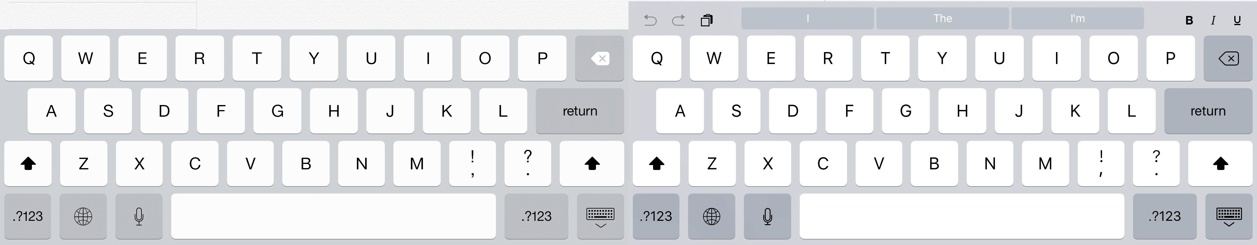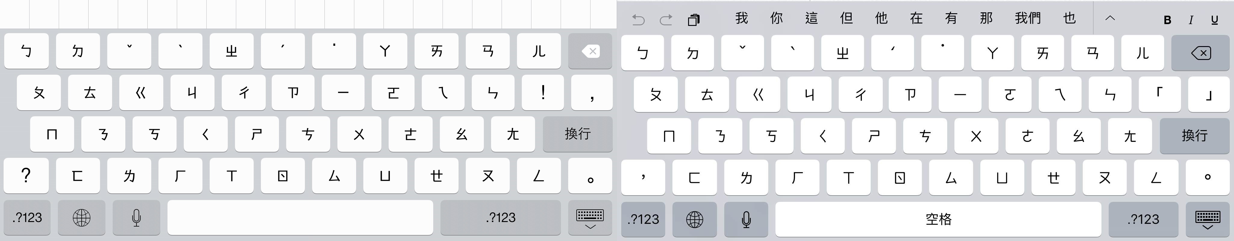 首先,一些按鍵顏色對比提升了,左邊的是ios7的鍵盤,右邊的是ios9的鍵盤。第二個不同,注音符號佔按鈕的比例也提升了,以原比例為基準,約增加了20%。第三個不同就是上方即便在沒有輸入任何位元的時候也會出現選擇清單;也增加了一些常用的選項。第四個改變是注音符號變得更有稜有角,增加區辨時的便利性。這幾個做法,都能提升使用者輸入時的效率!